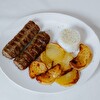 Lukaniko, tzatziki, patate fritte, pomodori e cipolla